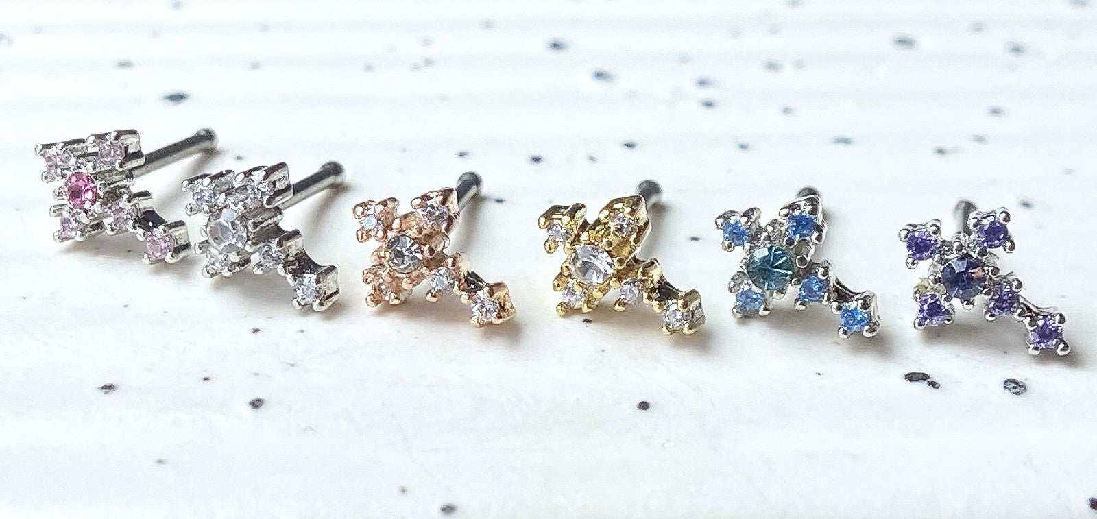 Materials: 316L surgical steel post, rhodium/gold plated brass design/gem setting, CZ gems