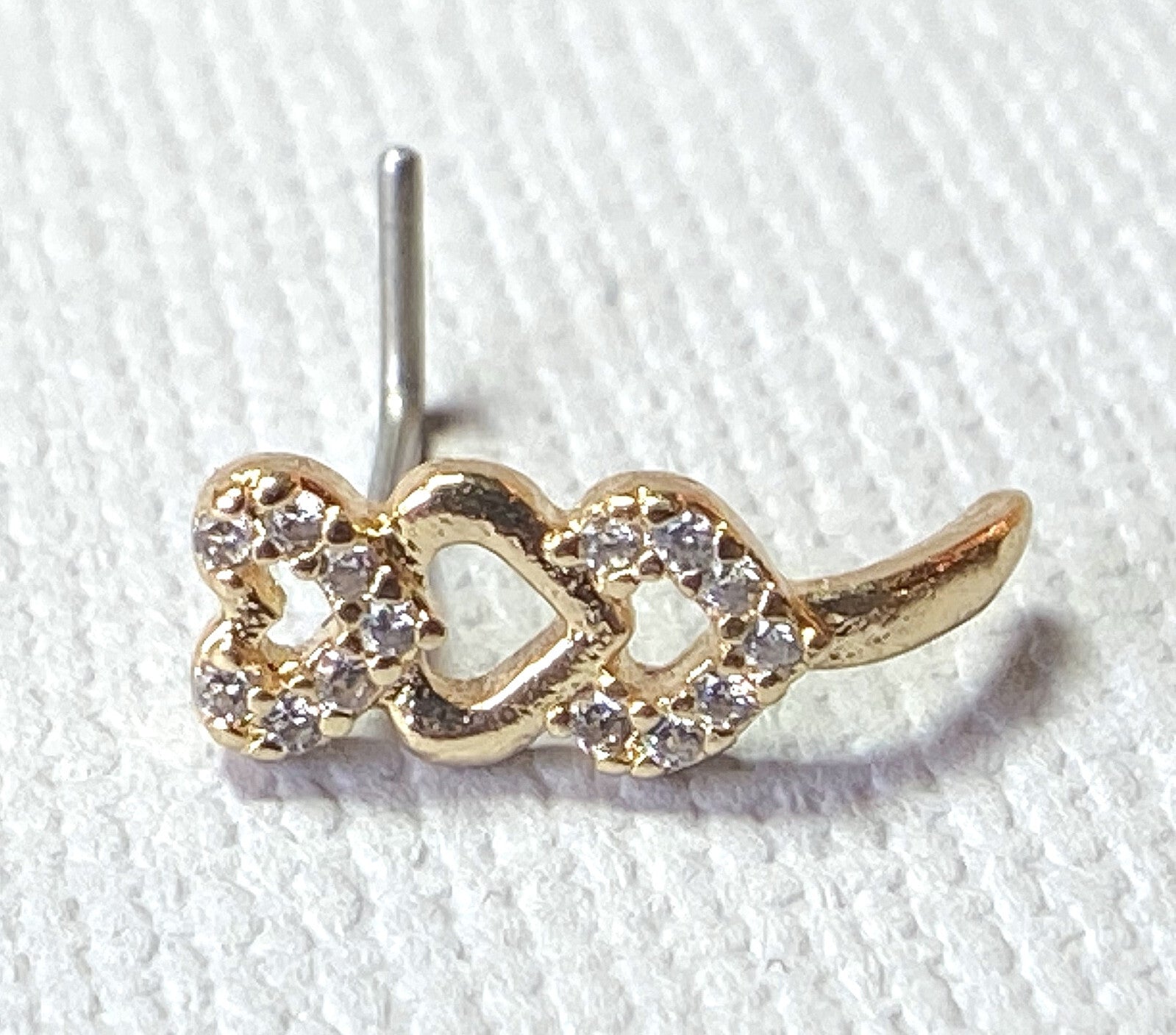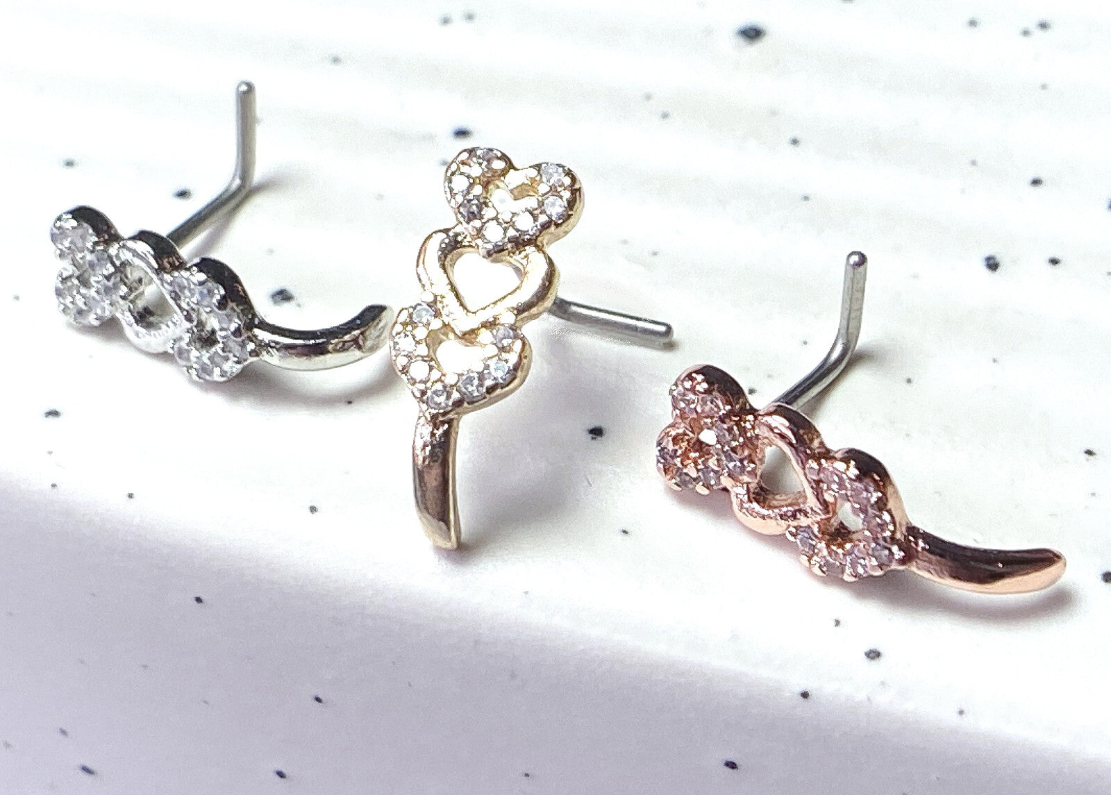 1pc CZ Gem Paved Triple Heart Nose Crawler L-Bend 20g Nose Ring Stud Screw