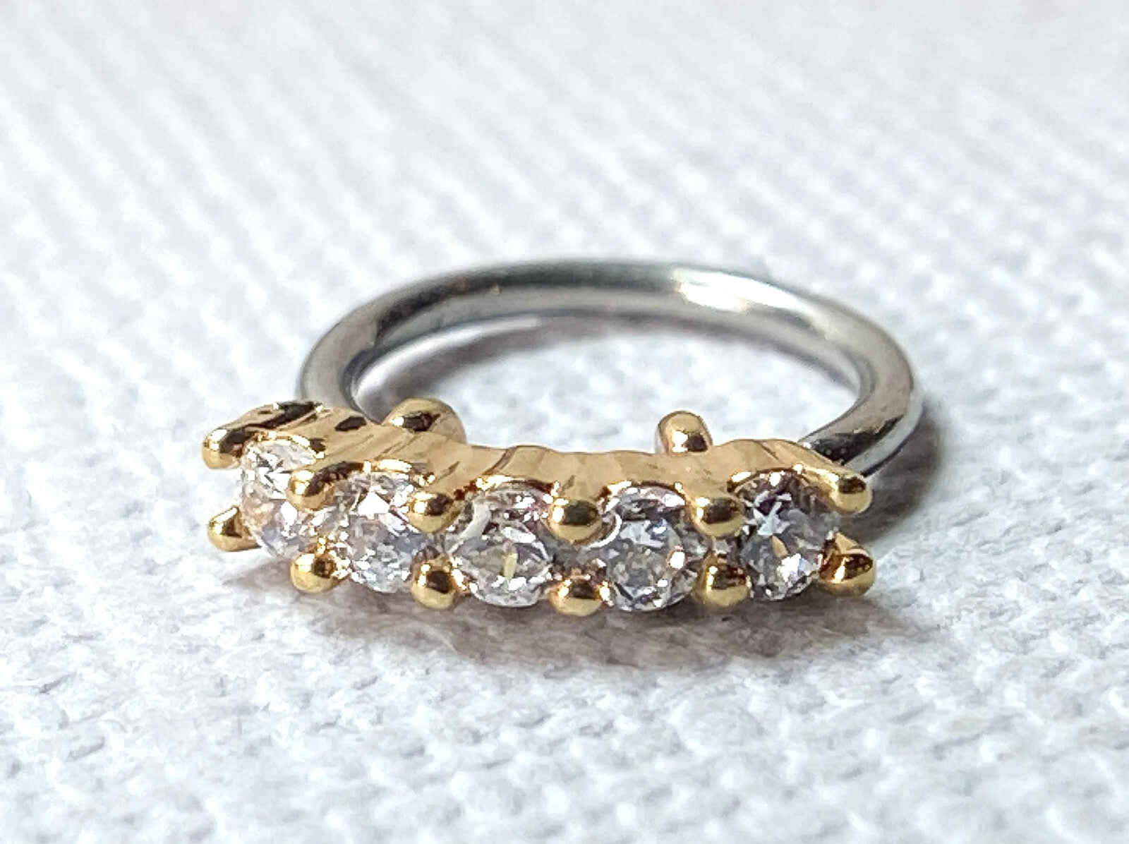Materials: 316L surgical steel hoop, rhodium/gold ion plated brass gem design/gem setting, CZ gems