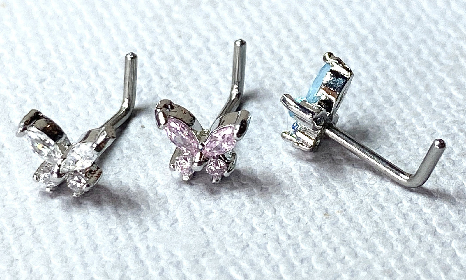3pc Value Pack L-Bend CZ Gem Butterfly 20g Surgical Steel Nose Rings