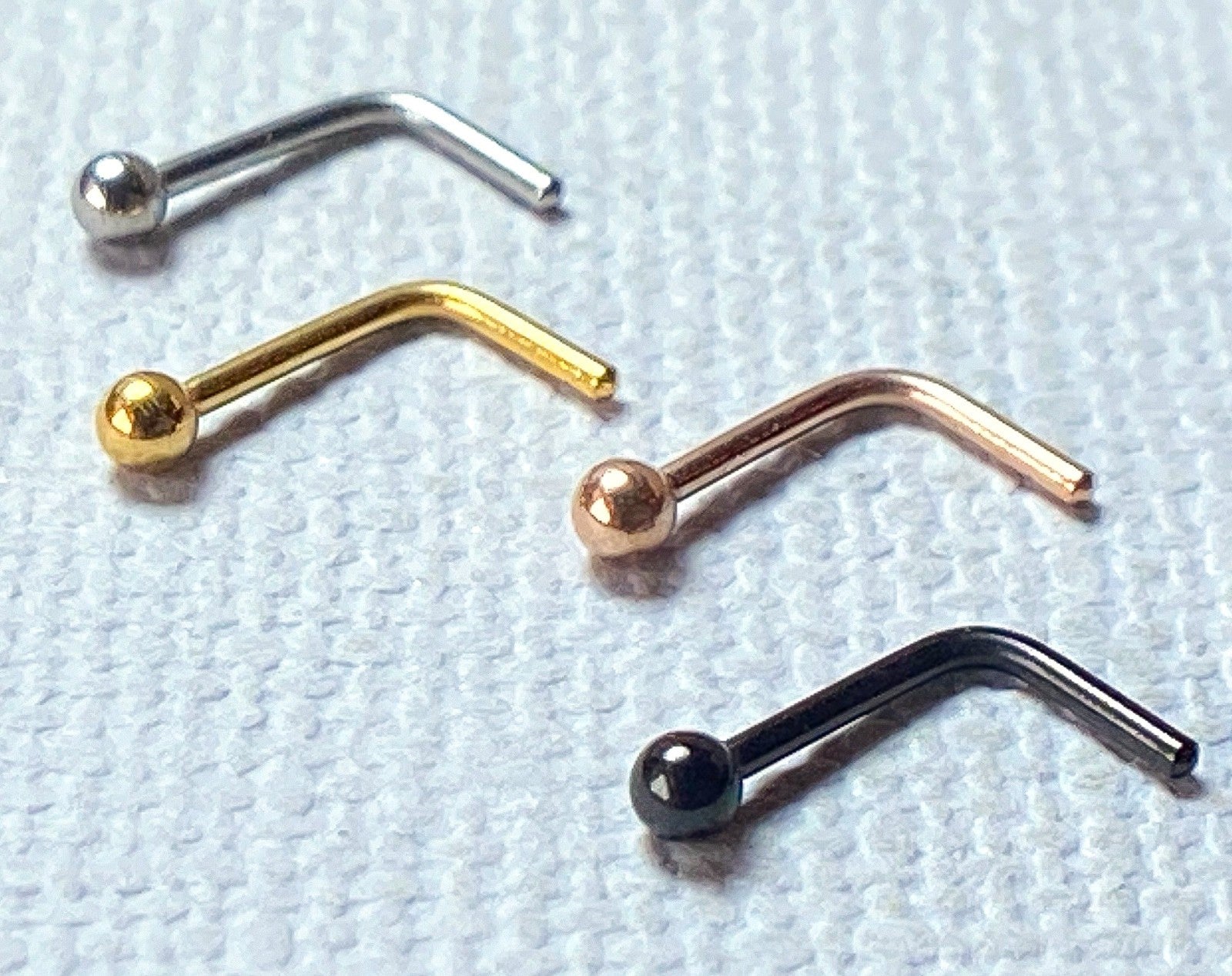 4pcs Ball End Steel L-Bend Nose Rings (a quantity of "1" gets you 4 pcs - 1pc each in silver, gold, rose gold and black)