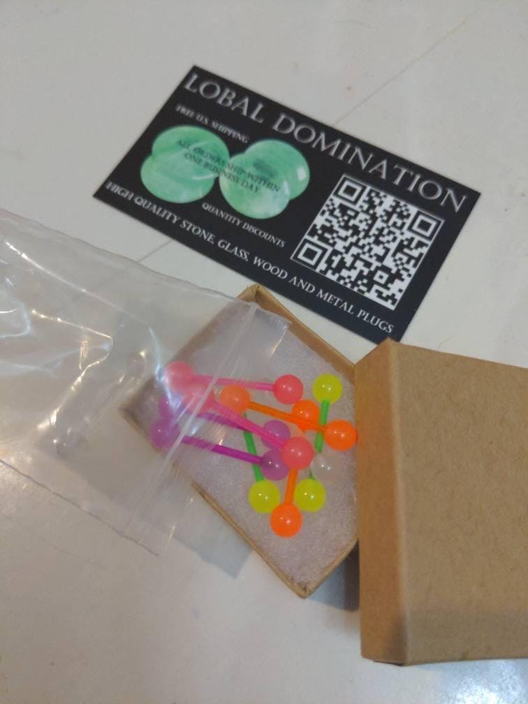 12pc Value Pack Nipple or Tongue Rings / Barbells Material: Bio flex post, acrylic balls Measurements: Barbell - 14g x 5/8" (16mm) length, Ball Diameter - 6mmEVERYTHING we sell is brand new, never worn. Feedback: Your satisfaction is important to us. If for any reason you feel like we don't deserve a 5-star rating in every category please allow us the opportunity to rectify the situation. While many situations such as postal delays are out of our hands, we will do whatever we can to alleviate any problems that may arise. |