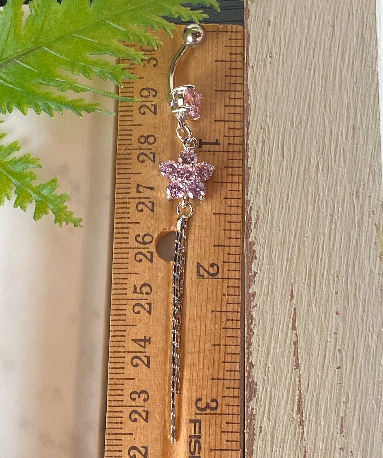 Flower Gem Chain Dangle Belly Ring Navel Naval Clear, Pink, Gold Plated Clear