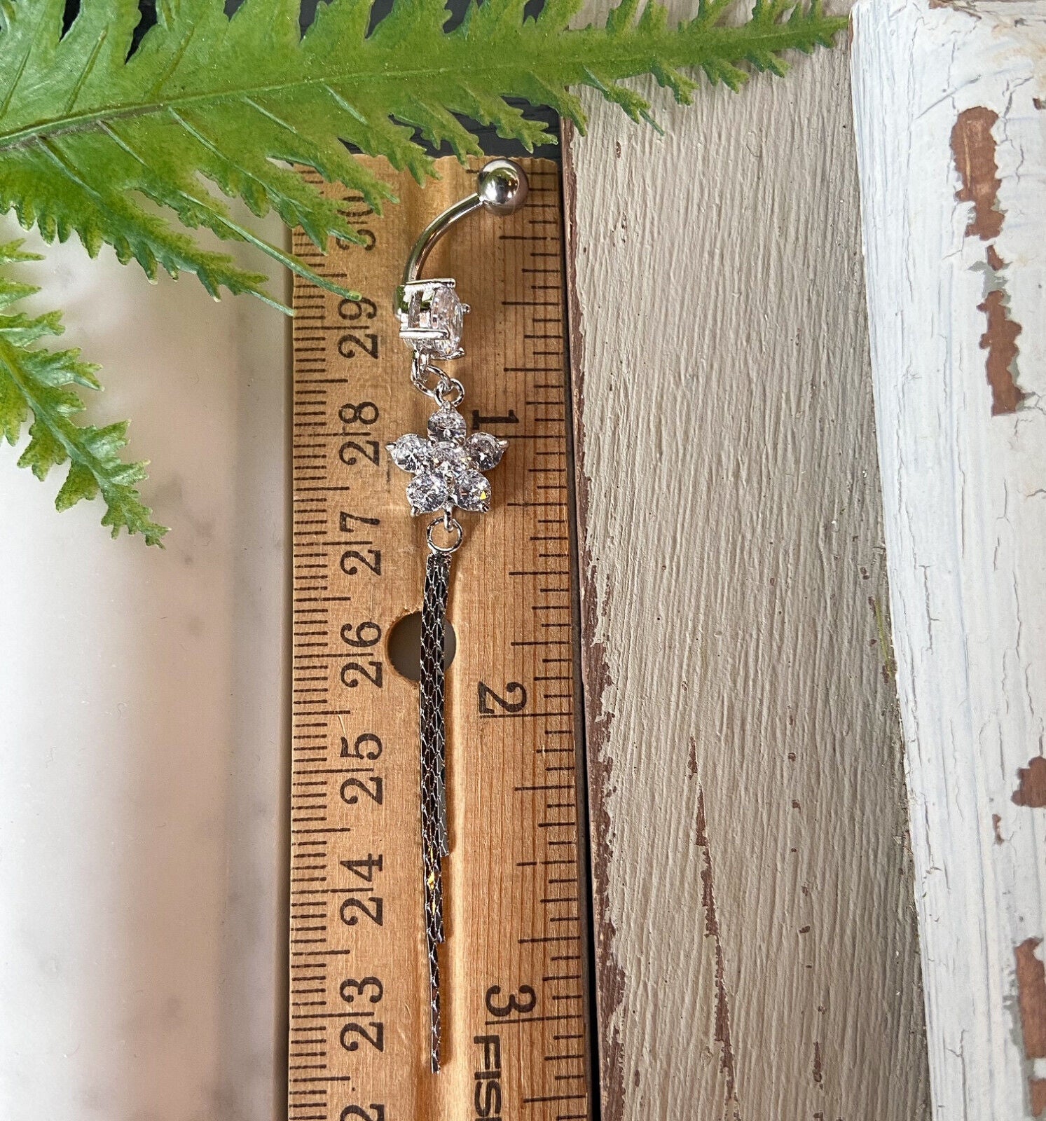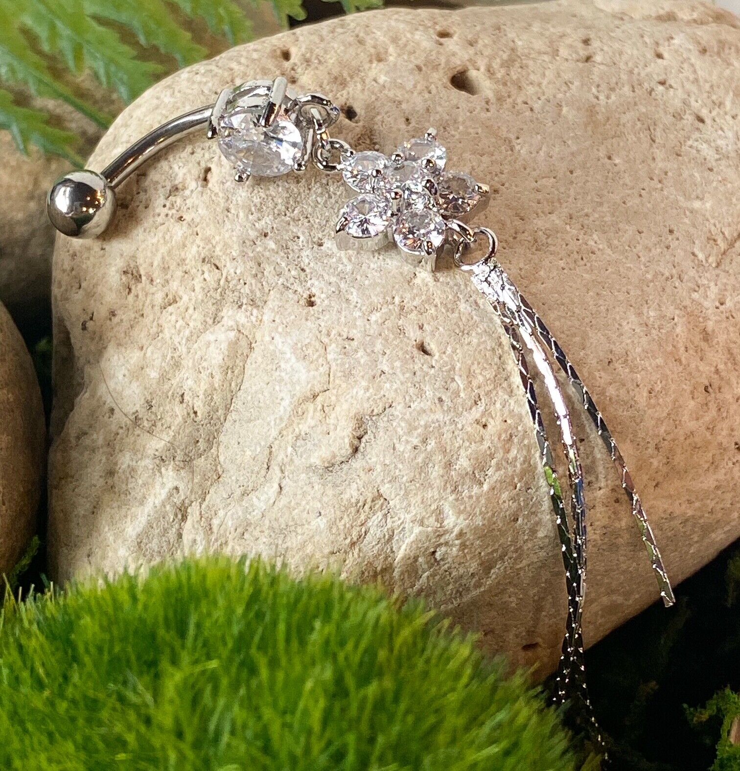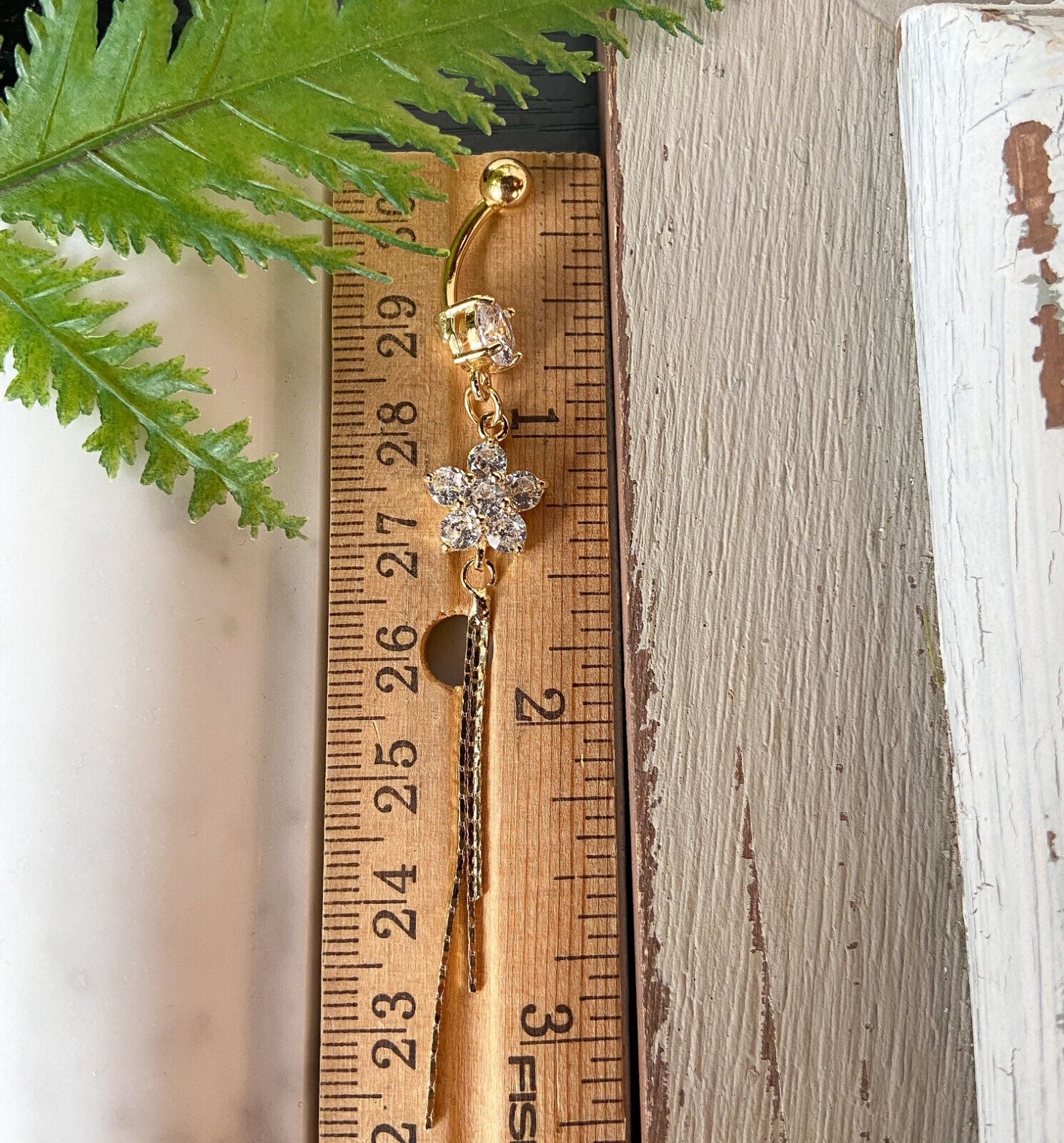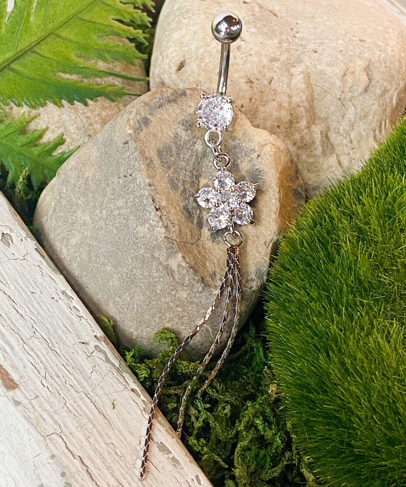 Flower with CZ Gems & Chain Dangles Belly Ring - Select color from drop down menu above