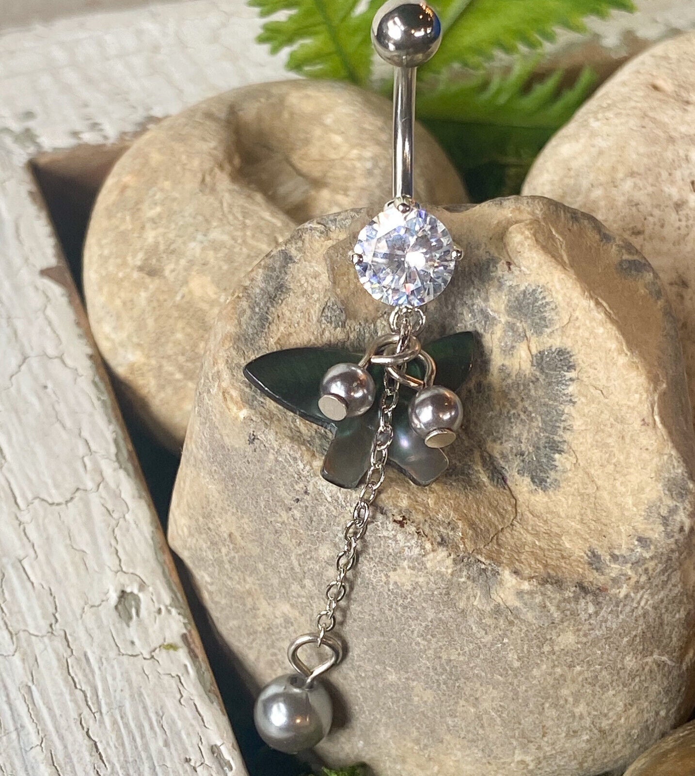 Mother of Pearl Butterfly & Beads Belly Ring CZ Gem Pierced Navel Piercing Naval