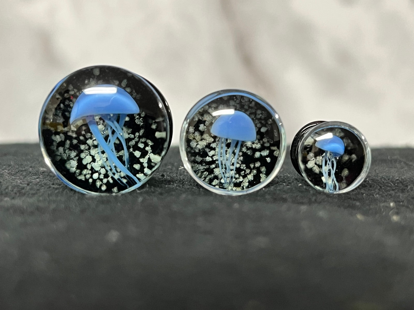 PAIR Blue Jellyfish Glass Double Flare Plugs Tunnel Gauges Glow in the Dark