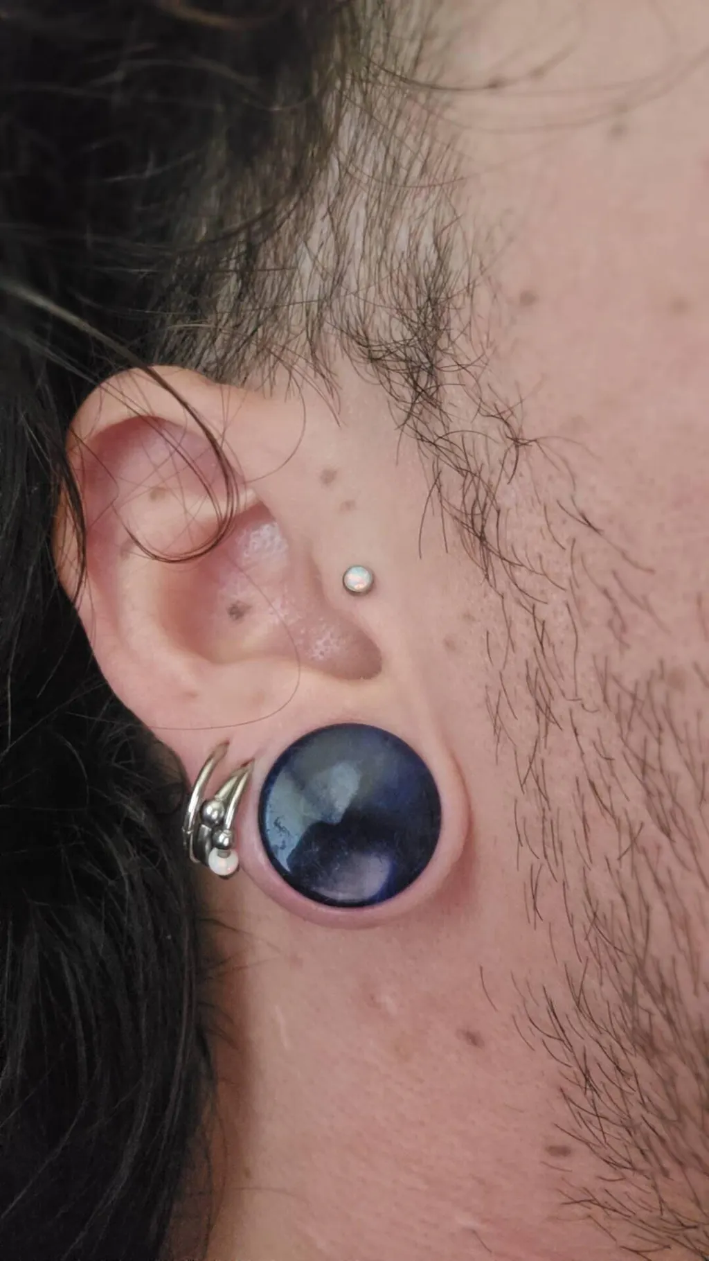 Overall very pleased. The item is a slightly darker/more opaque than expected, but is acceptable variation. They appear black while being worn indoors, very blue in sunlight, which was very unexpected. No weird cuts, chips, cracks, or pores. The face is flatter than expected, I actually like that better. They are a pleasant weight, slightly heavy for more elastic skin. Would be a good choice to get a gentle stretch. Comfortable to wear all day and night. The saddle is comfortable. The flare is a suitable choice for stretchier skin, I would downsize if you struggle with flares. Might be hard to remove if your ear swells. The wearable depth is on the small side of average, I wouldn't recommend for chonky lobes. Low profile enough for the office and snazzy enough for everyday. Pair well with gold and silver. Pair well with opal.