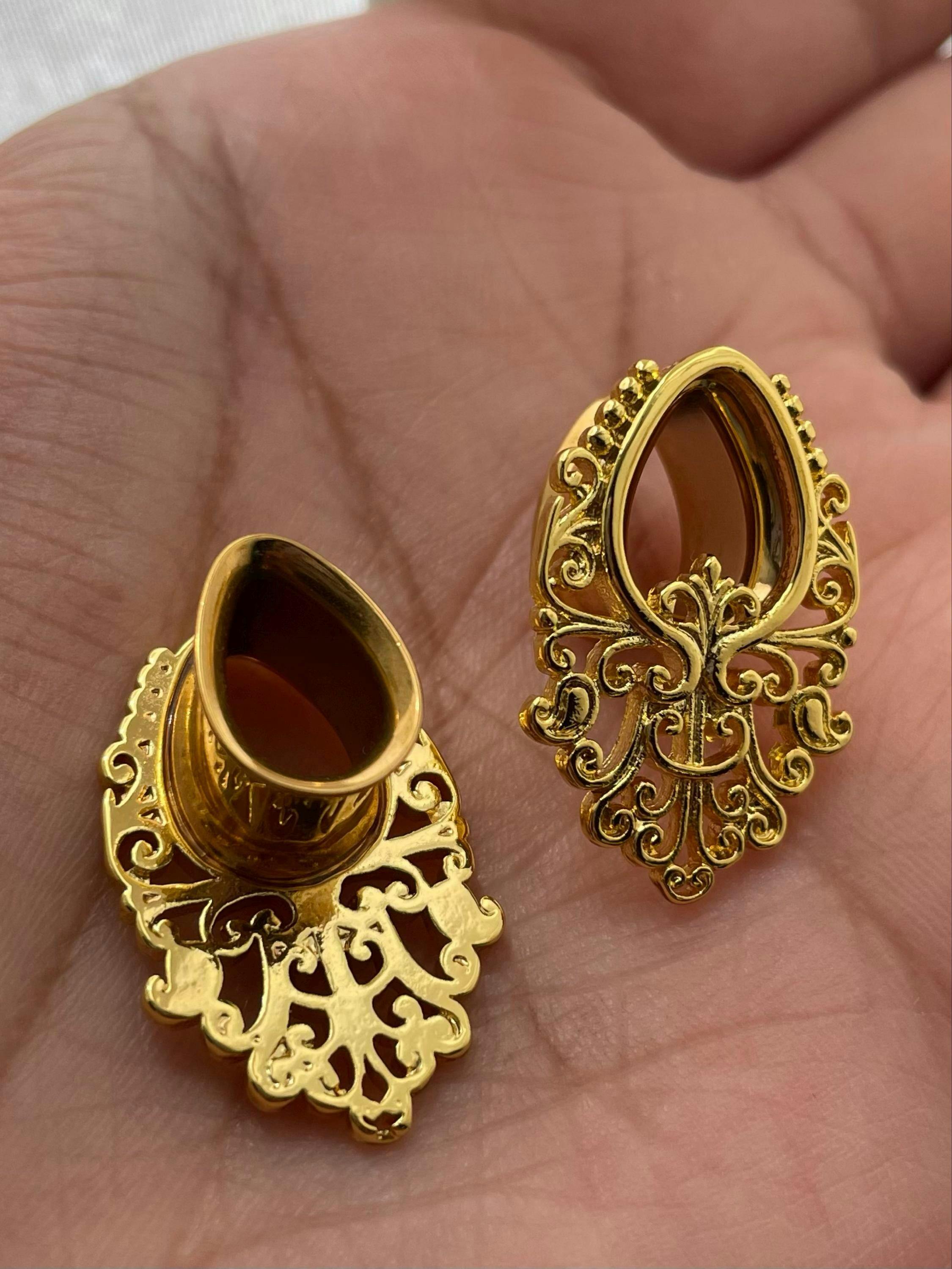 PAIR of Filigree Teardrop Double Flare Tunnels/Plugs - Available in silver or gold - You choose:)