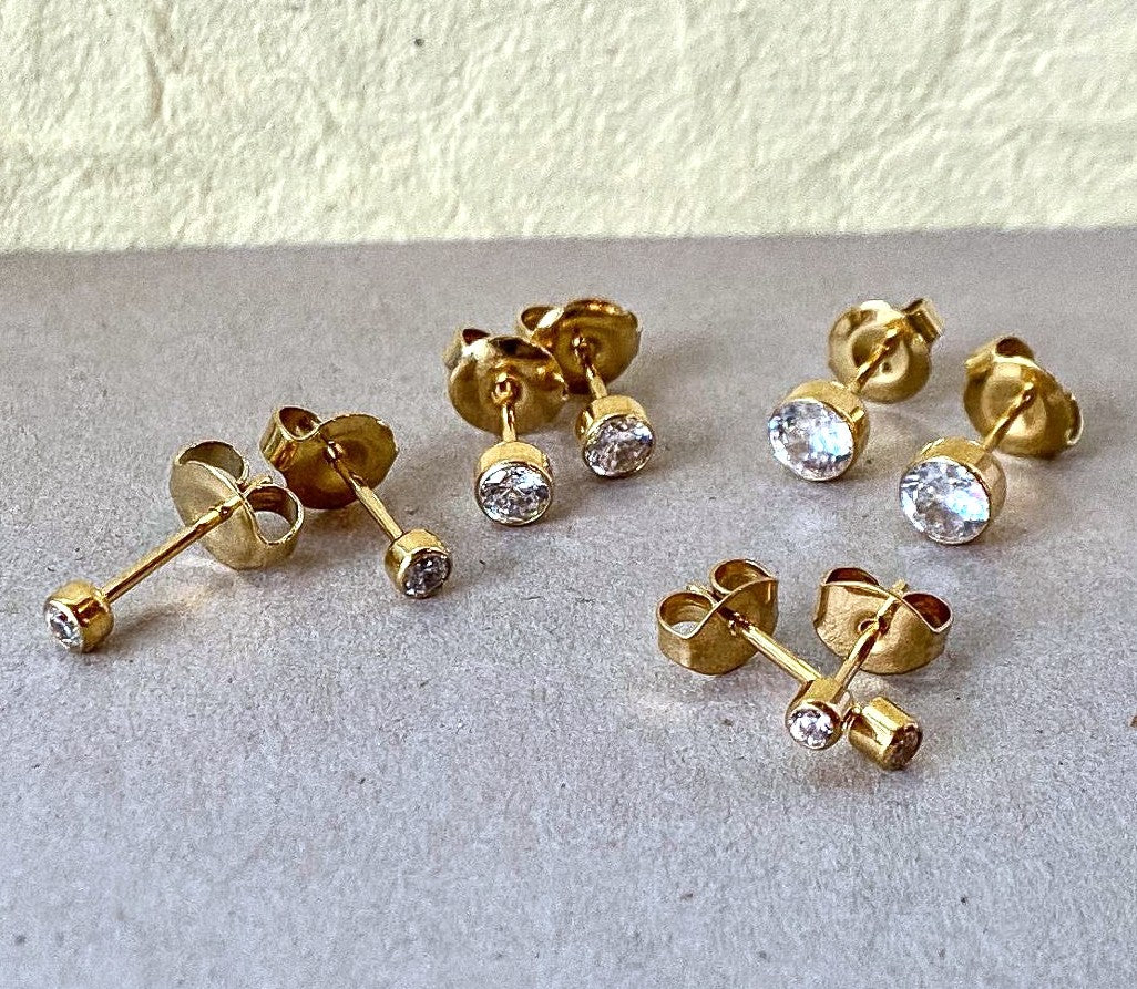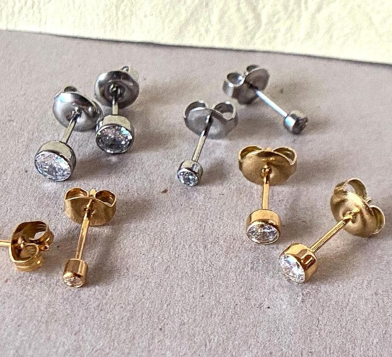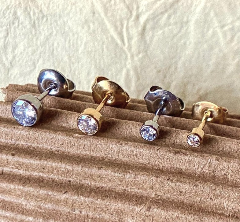 Material: 6AL-4VELI ASTM F-136 titanium post/gem setting (gold color are PVD plated), 316L surgical steel back clasp, cubic zirconia gems
