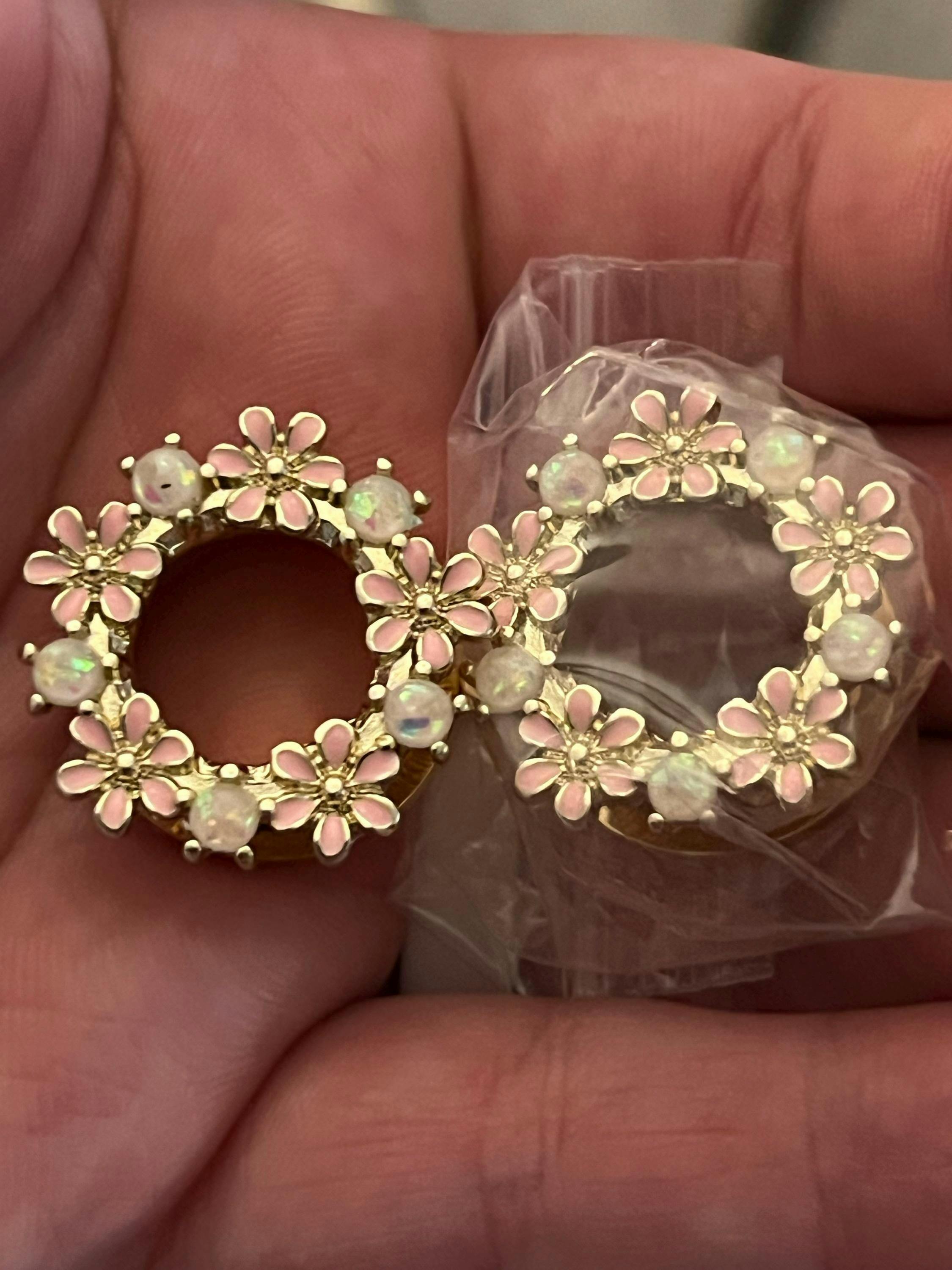 Material: Gold PVD plated 316L surgical steel tunnel/back disc, plated brass front design, enamel flowers, resin imitation opals