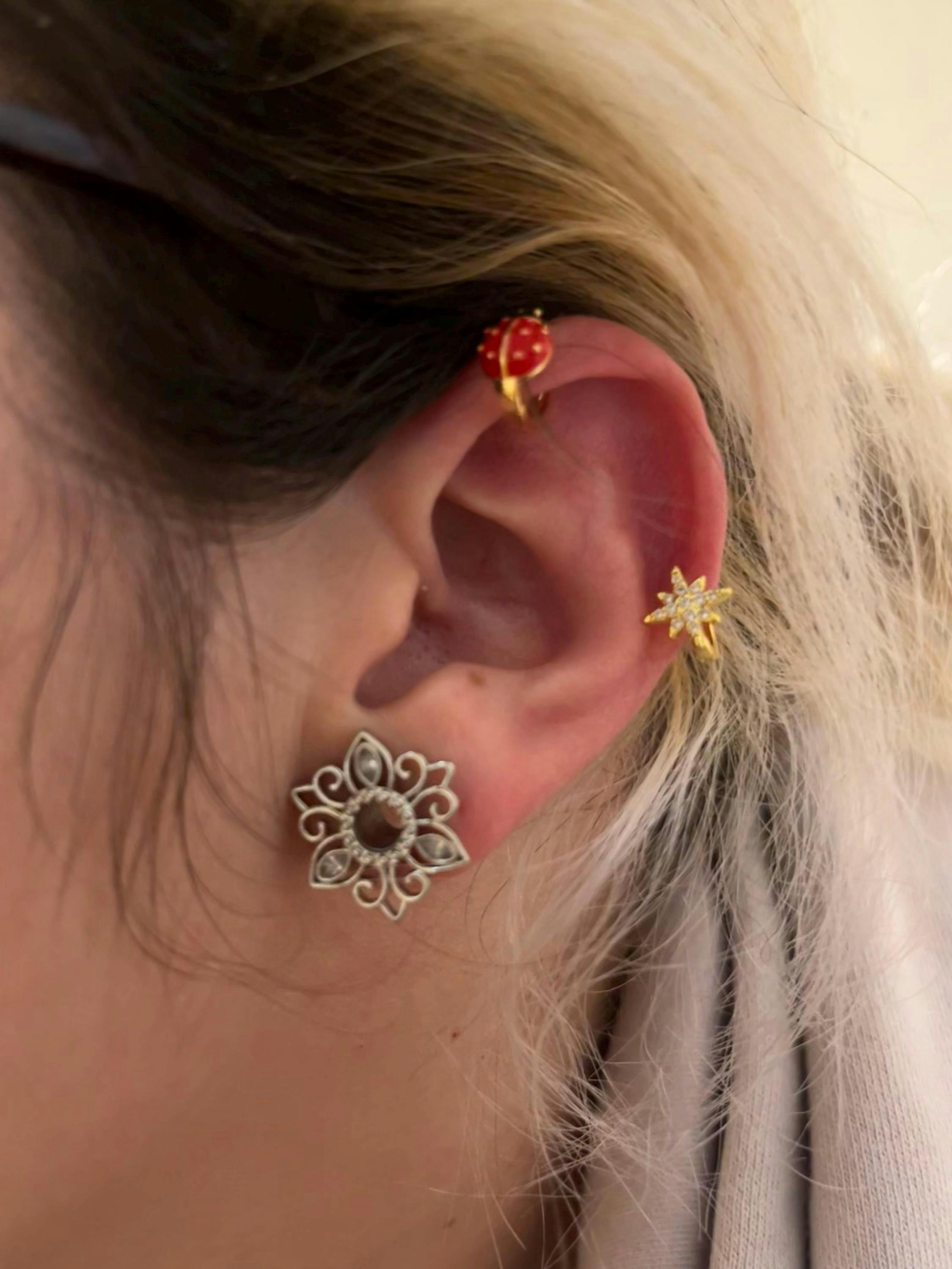 Very stunning piece and I love that it's a somewhat local buisness! Unfortunately the design flares out far too much for my ears, it doesn't fit with my other lobe piercings and covers my entire ear lobe, if you like that I'd recomend as they're great quality and so stunning but unfortunately it's not quite right for me, the pictures on the post don't really show how big they really are.