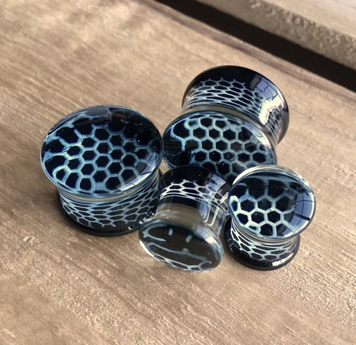 PAIR of Unique Black Honeycomb Design Pyrex Glass Double Flare Plugs - Gauges 2g (6mm) through 5/8" (16mm)
