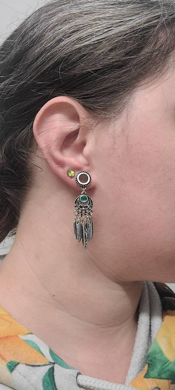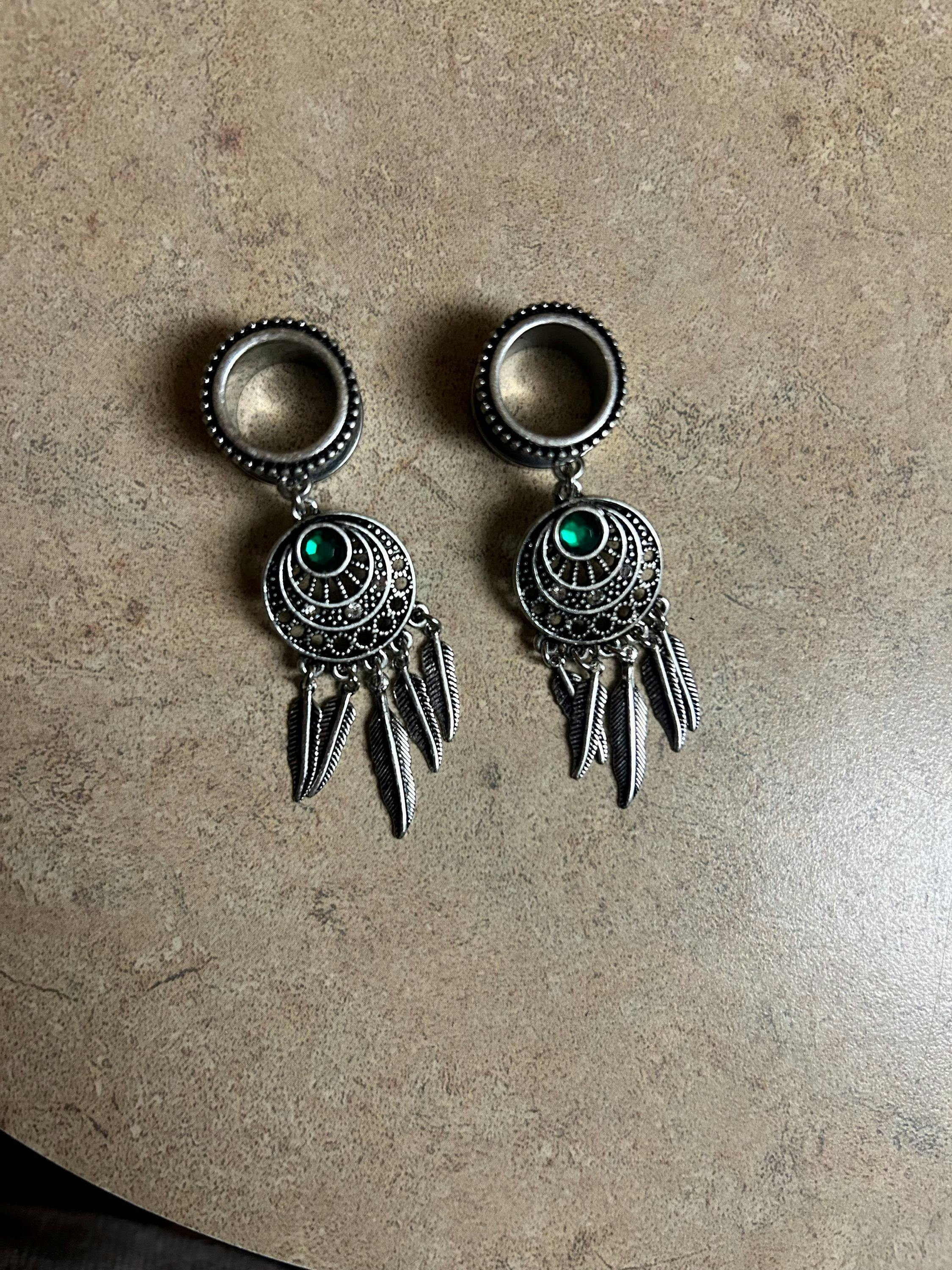 PAIR of Unique Dream Catcher with Beaded Edge and Green Crystal Gem Dangle Screw Fit Tunnels -Gauges 4g (5mm) thru 5/8" (16mm)
