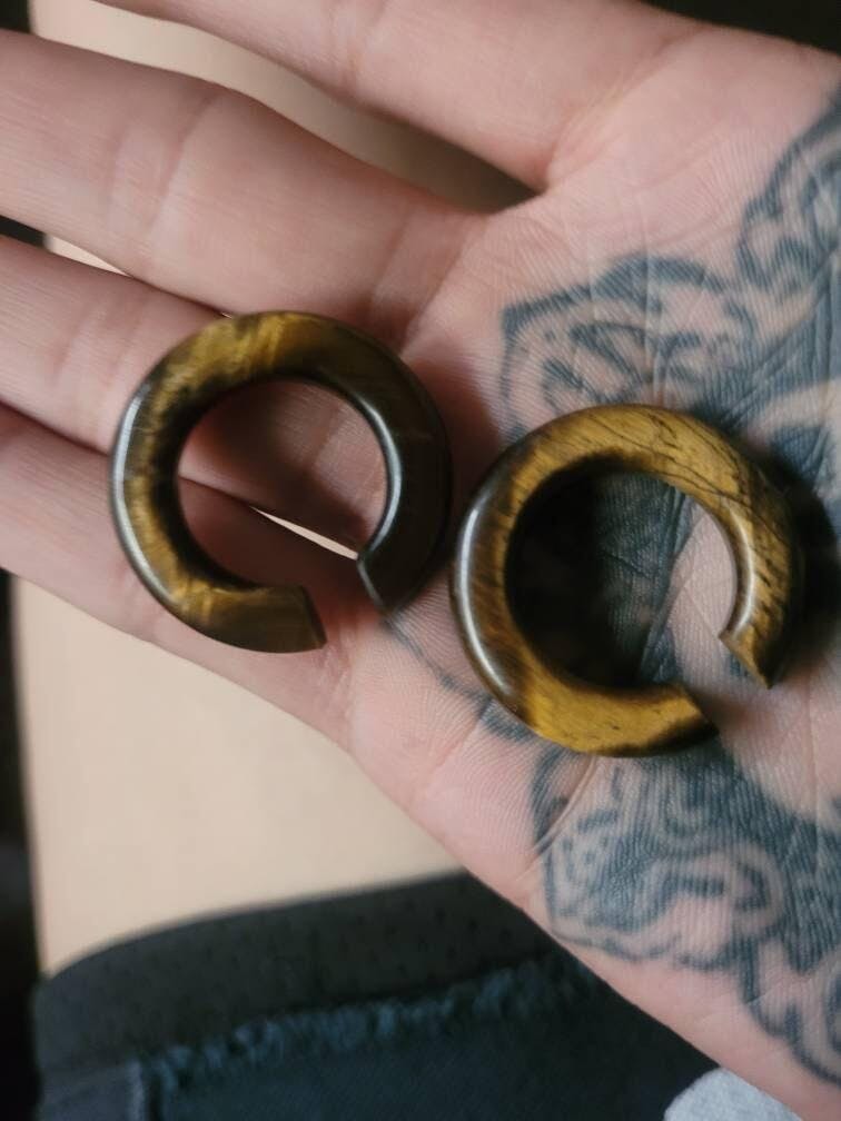 PAIR of Unique Organic Tiger Eye Stone Hoops Ear Weight Hanging Plugs - Gauges 2g (6mm) up to 5/8" (16mm)