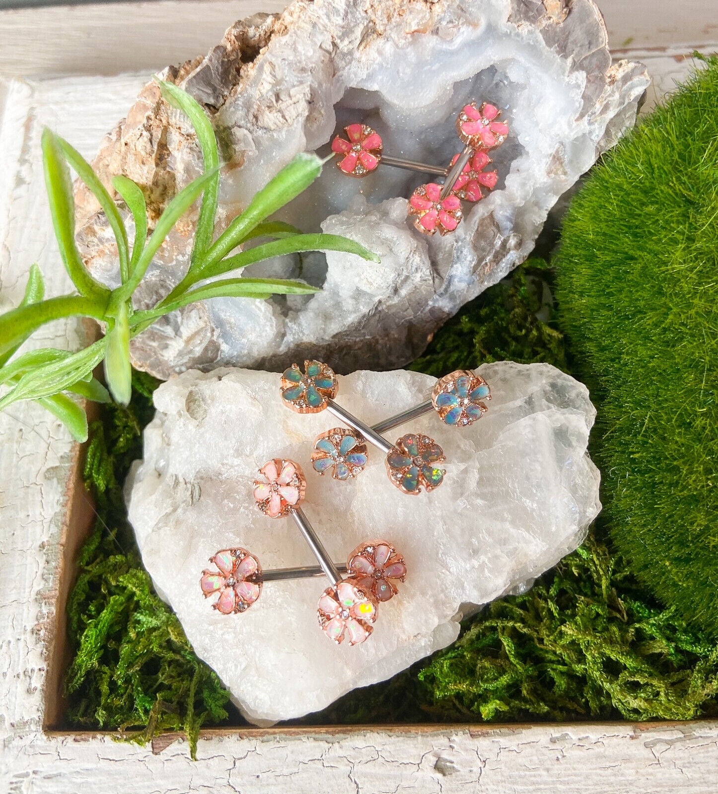 Materials: 316L surgical steel barbell, plated brass design/gem settings, resin imitation opals