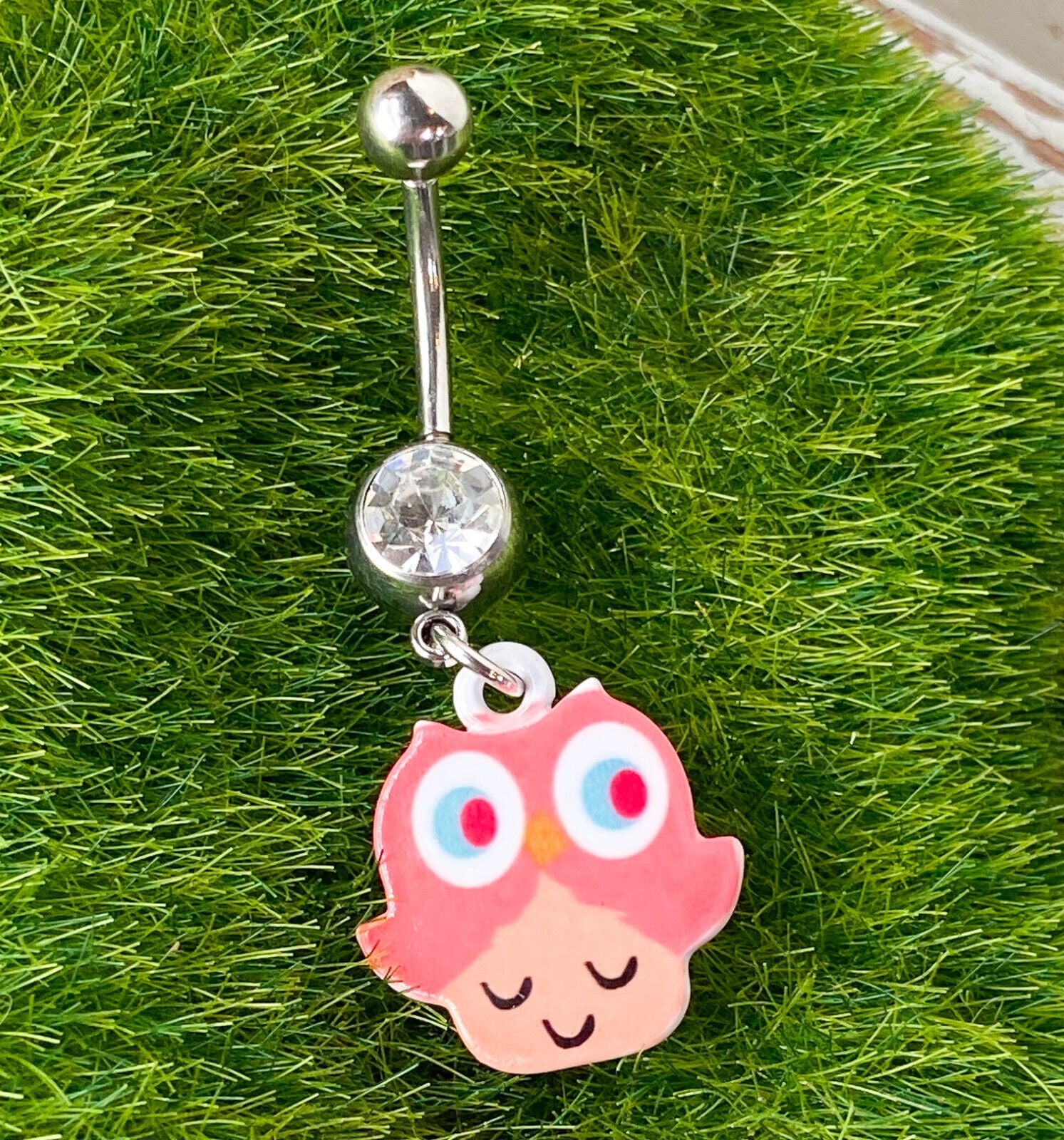 Pink Owl Dangle Clear Gem Belly Ring Navel Piercing Pierced Naval