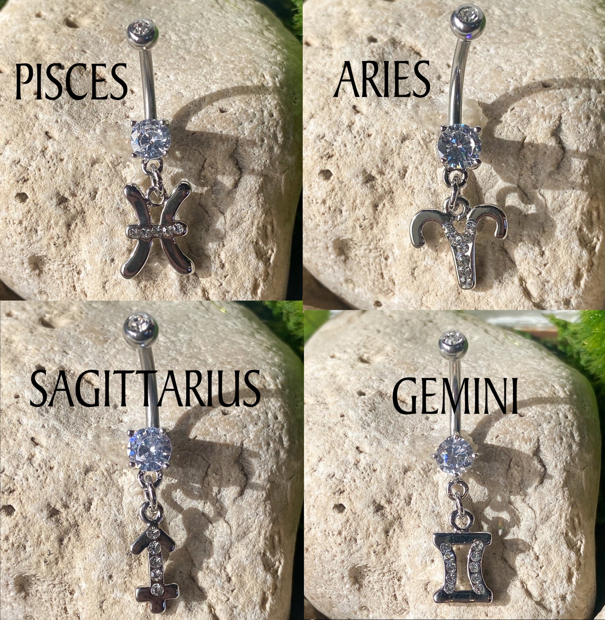 Zodiac Sign Paved CZ Gem Belly Ring Pierced Navel Astrology 14g Surgical Steel